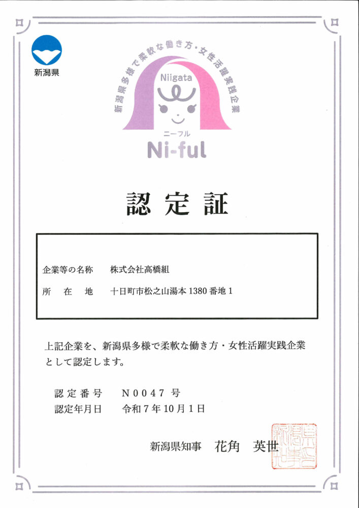 - 新潟県多様で柔軟な働き方・女性活躍実践企業として認定される。(認定番号 N0047号)